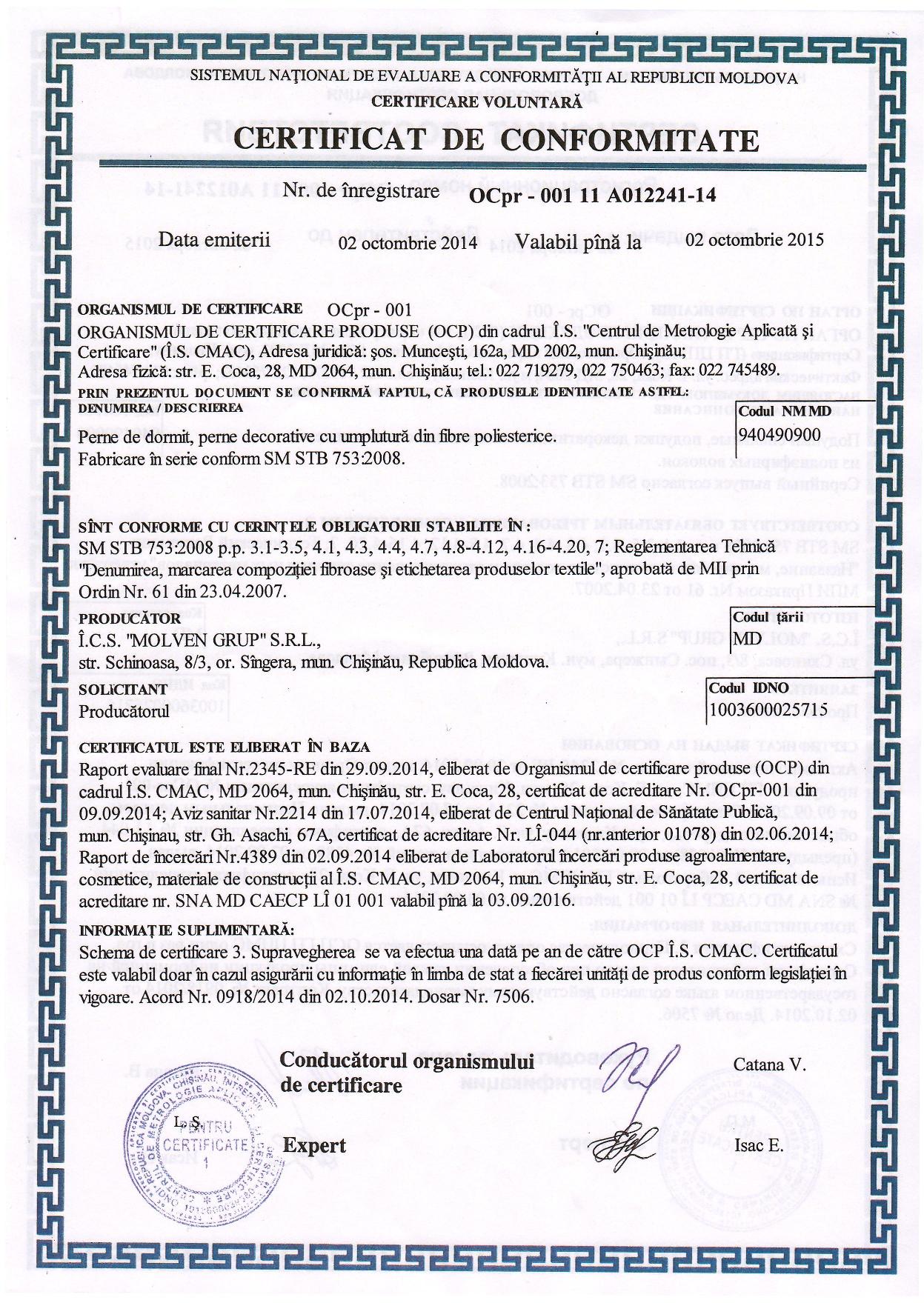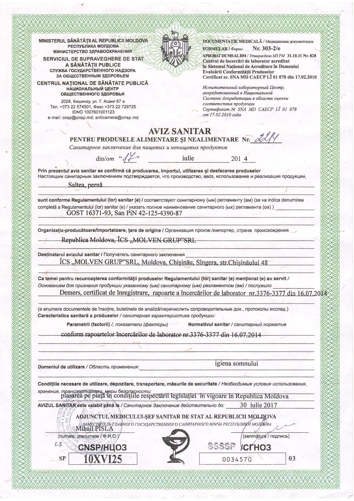 In diferitele etape de producție sunt efectuate controale de calitate în conformitate cu sistemul de management al calității interne, CERTIFICAT de CONFORMITATE și AVIZ SANITAR.